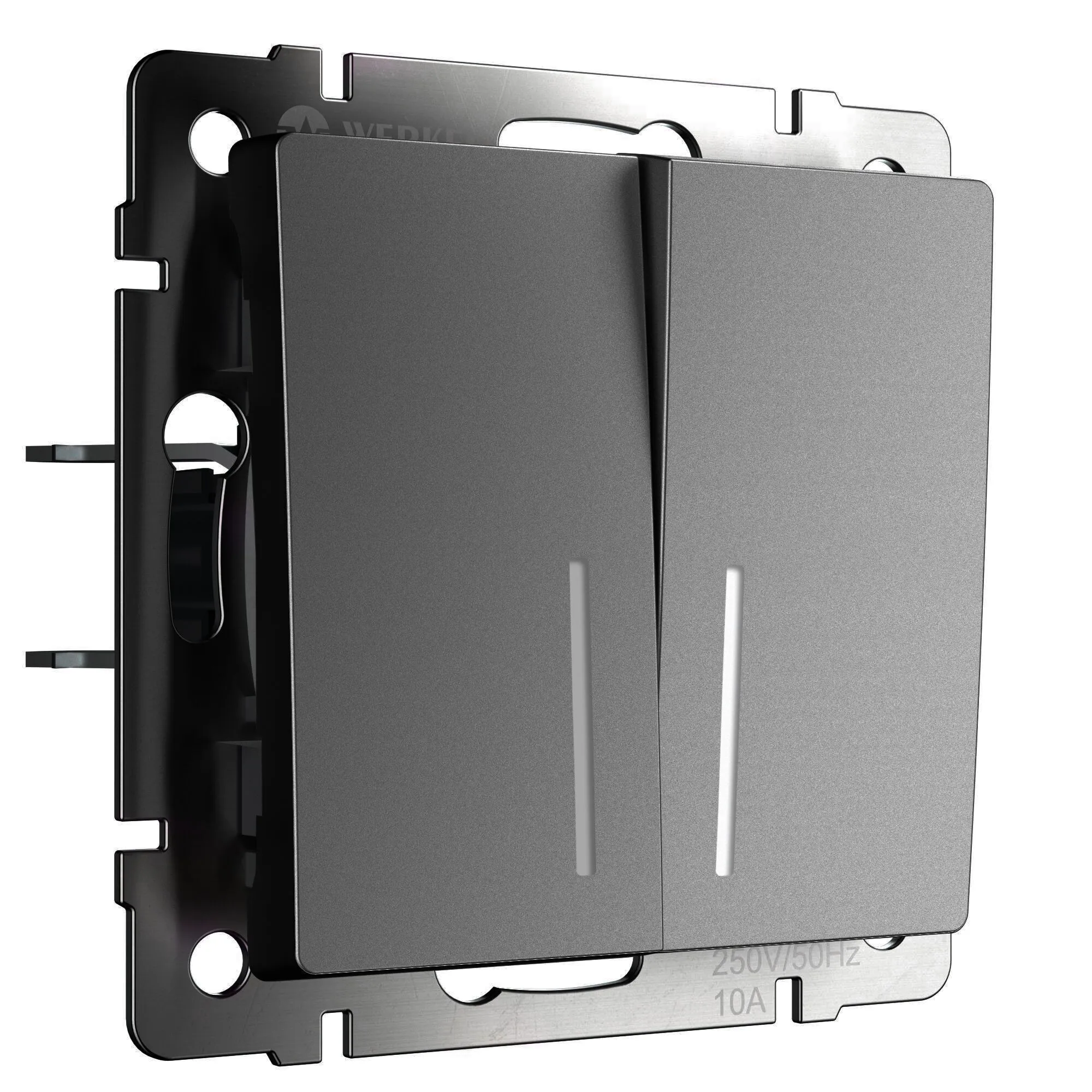 Выключатель двухклавишный с подсветкой графит матовый W1120164 рассчитан на 10А и 250В - представляет собой механизм нажимного типа с металлическим суппортом и декоративными накладками. Тусклый свет светодиодов облегчает поиск выключателя в тёмное время суток и помогает ориентироваться в квартире, доме или комнате.